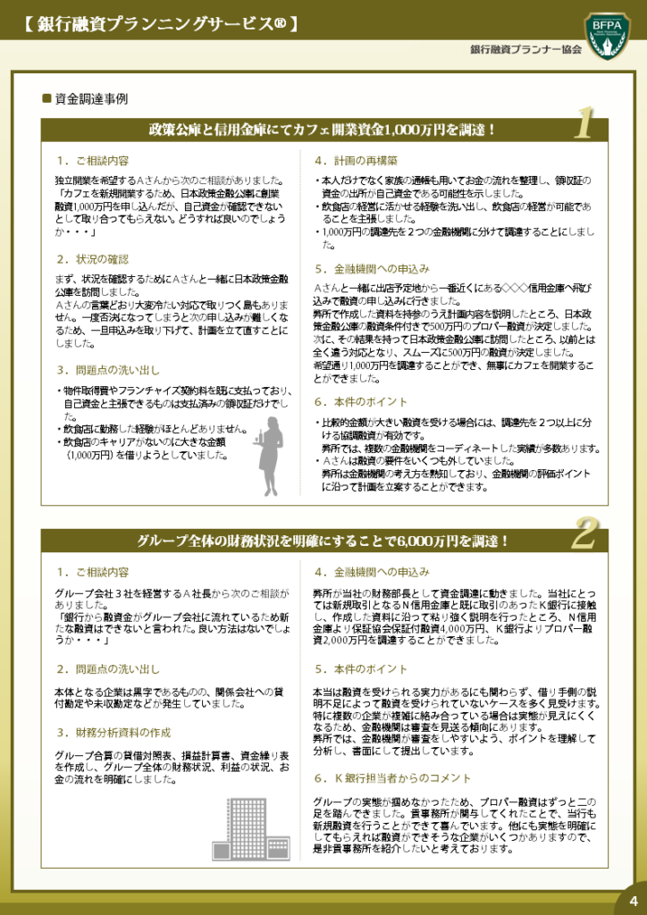 弊所が貴社のご依頼を受けて、貴社の財務部長的な立場で、融資戦略の立案・必要書類の作成・金融機関との調整業務等を行います。