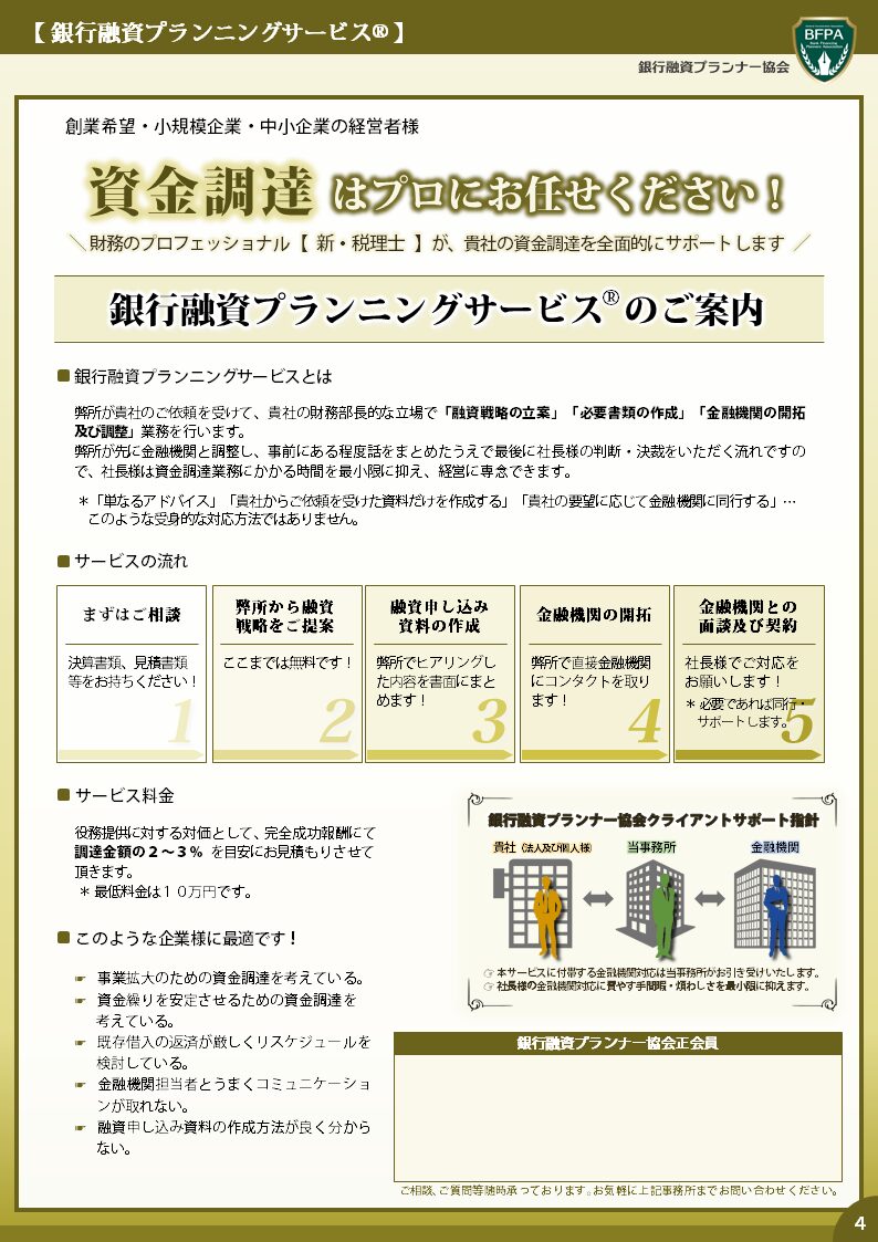 弊所が貴社のご依頼を受けて、貴社の財務部長的な立場で、融資戦略の立案・必要書類の作成・金融機関との調整業務等を行います。