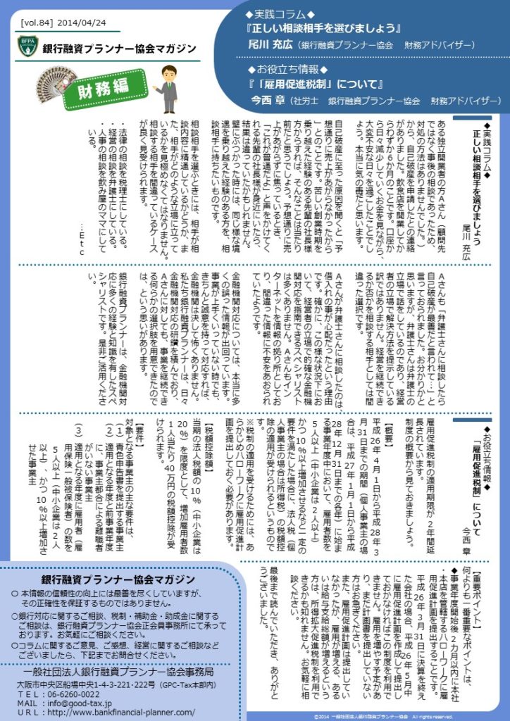 vol.84『正しい相談相手を選びましょう』+『「雇用促進税制」について』 2014年4月24日 最終更新日時 : 2020年5月24日 GPC-Tax 『正しい相談相手を選びましょう』+『「雇用促進税制」について』ダウンロード